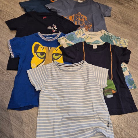 Polarn O. Pyret t-skjorter til gutt i størrelse 134. Pakke med flere kortermede t-skjorter i bomull, i ulike flerfargede mønstre og motiver, blant annet striper og dyreprint. Egnet til hverdagsbruk for barn i aktuell størrelse.