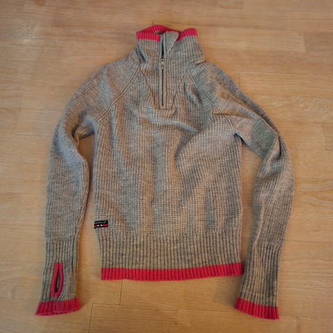 Grå half-zip Devold ullgenser (100% ull) med himmelblå detaljar. Genseren er god og varm og i svært god stand, den har ingen slitasjehol. Den har tommelhol, sjå bilete. Perfekt som mellomlag.