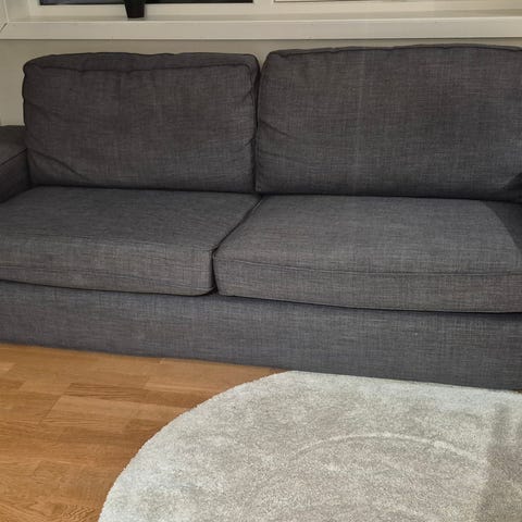Ikea-sofa med grått stoff. Den leveres med en oppbevaringsdel som jeg ikke er sikker på hvordan man fester til sofaen. Jeg har brukt den til å strekke på beina når jeg har sittet i sofaen. Den er brukt, men den rengjøres regelmessig med støvsuger og desinfiseres med dampvasker. Sengen er grei, den gjør jobben sin (har plass til 2 personer). Kan brukes som ekstraseng for gjester og så videre. Sengen er rundt 200 x 140 cm. Høyre armlener er kjøpt ny nylig, da denne modellen kan modifiseres på forskjellige måter. Må hentes. Den kan demonteres, men det er best å hente den som den er.