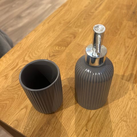 Baderomssett i gullfarge bestående av toalettrullholder, såpedispenser, tannbørsteholder og såpeskål. Overflaten har strukturert mønster.
