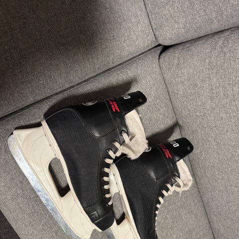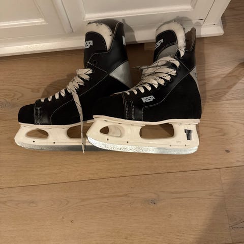 Ishockeyskøyter i ca størrelse 43. Passer til voksen fot med skostørrelse rundt 43. Har ligget lagret i bod en del år, men relativt lite brukt