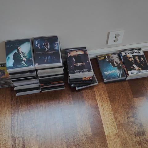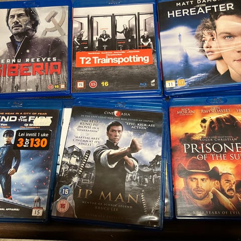 Blandet samling Blu-ray og DVD filmer i ulike sjangre. Bildene viser blant annet titler som «The Good, the Bad and the Ugly», «Fight Club», «Gran Torino», «Shutter Island», «Leon», «Watchmen», «Trainspotting», «The Bourne Ultimatum» og flere andre. Filmene er i originalcovere. Egner seg for deg som ønsker en variert samling spillefilmer på fysisk format.