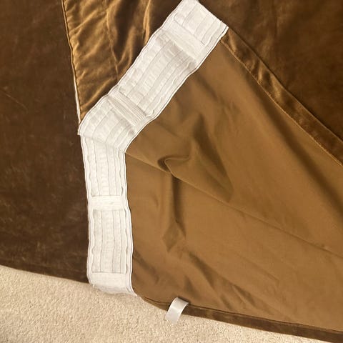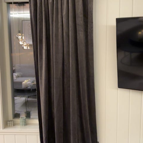 Kid gardin i mørk blå farge. Gardinet har lystett eller mørkleggende innside i lys grå og påsydd rynkebånd øverst for oppheng på skinne eller stangkrok. 2 stk. selger en for300.