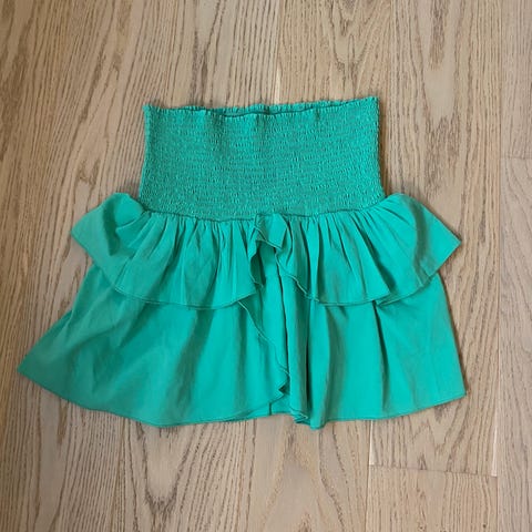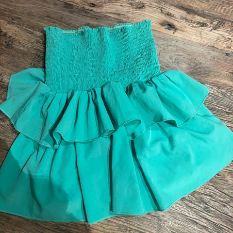 Modellen har smocket, elastisk liv og flere lag med volanger nederst som gir et lett og strukturert uttrykk. Kan brukes som både skjørt eller topp.