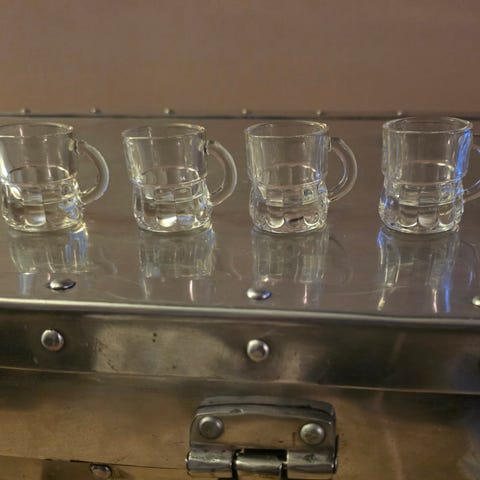 Glass 5 stk. Med stett, høyde på glass er 18 cm. Pr. stk 150. Alle fem glass 700 kr.