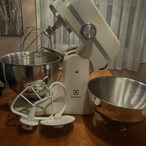 Electrolux kjøkkenmaskin med bolle og tilbehør i stål. Maskinen leveres med rustfri stålbolle og flere visp- og kroktilbehør, blant annet ballongvisp, deigkrok og flatvisp. Egnet til elting av deig, pisking av krem og røring av ulike rører og masser. Maskinen har justerbar hastighet og kontrollhjul på siden. Ytre overflate har en lys, nøytral farge og bollen har håndtak for enklere håndtering.