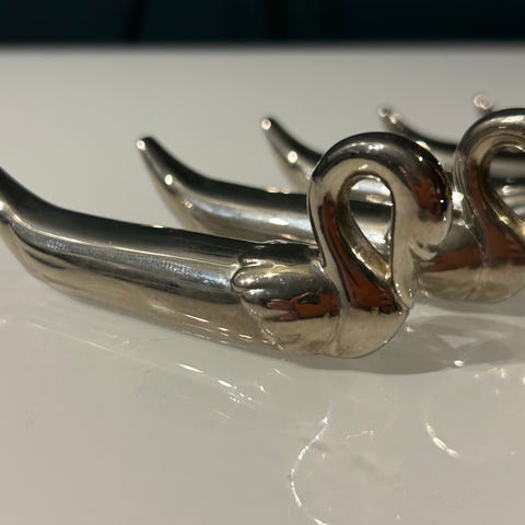 6 stk svane bestikk/knivholdere i sølvplett selges samlet for 200 kr. Passer godt til fint pyntede bord, til å legge både rent og skittent bestikk på. Ingen synlige skader eller bruksmerker.