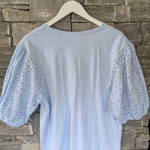 Bik Bok T-skjorte for dame i størrelse XS. T-skjorten er blå og laget av bomull. Den har rund hals og kort erm. Stoffet har broderte mønstre i kontrastfarge som gir et dekorativt uttrykk. Passer til hverdagsbruk alene eller under genser eller jakke.