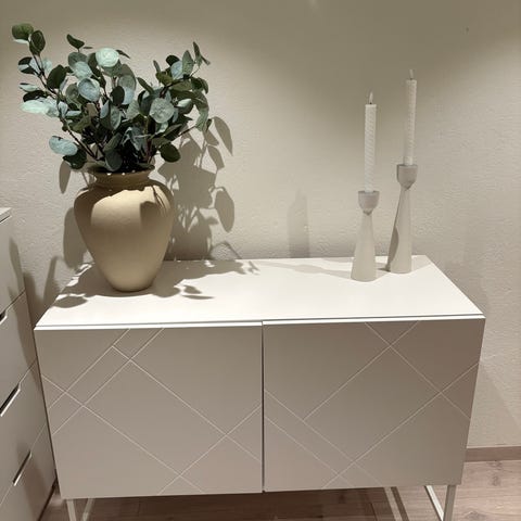 Hvit skjenk med hylle og to skuffer. Fremstår som ny.