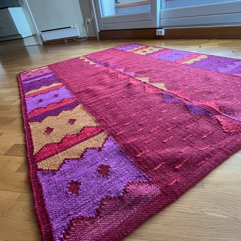 Alt selges samlet.!2 ensfarget putetrekk, 2 med blomstermønster 50*50 lik Gudrun Sjödén teppe med blomstermønster i flere farger. Teppets ene side har lyst bunnstoff med store blomster i blant annet oransje, rosa og grønt, mens den andre siden har mørkere bunn med tilsvarende motiv. Teppets kant er avsluttet med frynser. Passer som pledd i stue eller til duk,til soverom eller andre oppholdsrom, og kan også brukes som dekorativt tekstil i interiøret.
