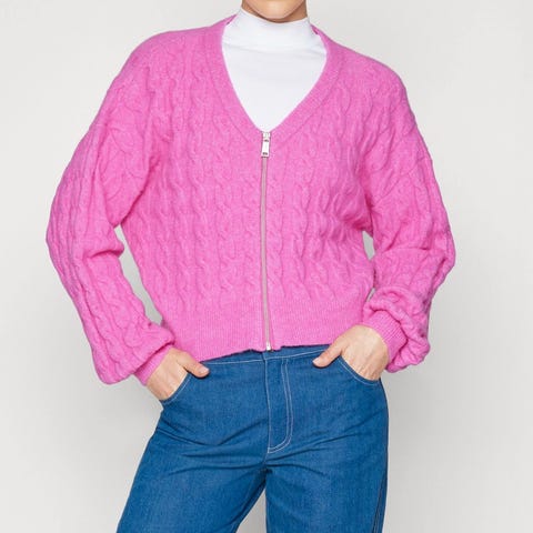 Gestuz cardigan for dame i størrelse S. Cardiganen er hvit og har et åpent, heklet/strikket mønster med hullstrikkdetaljer. Fine knapper