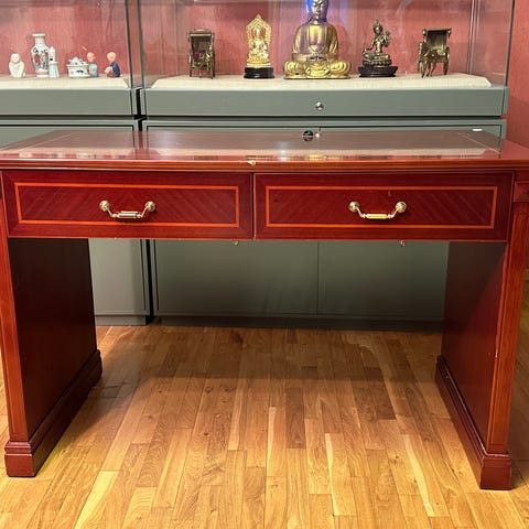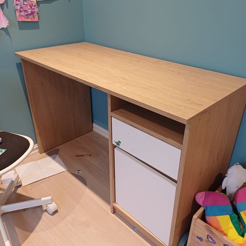 Nett og pent skrivebord med liten hylle og hjul selges.