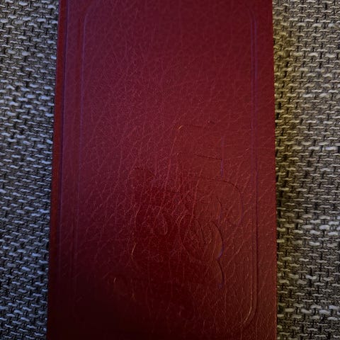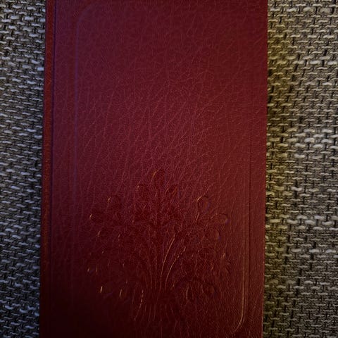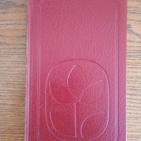 Torborg Nedreaas «Ved neste nymåne» innbundet bok i rød perm. Utgitt av Den norske Bokklubben. Boken har dekorert omslag med preget motiv på forsiden og rygg med tittel og forfatternavn.