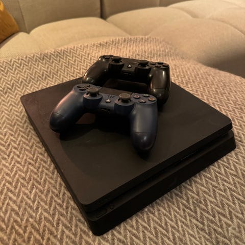 Sony Playstation 4 spillkonsoll i svart farge med to trådløse kontrollere. Konsollen er egnet for spilling av Playstation 4-spill, streaming av media og bruk av ulike apper.