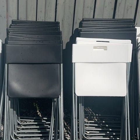 Behagelige stoler som passer pent rundt hvitt bord.
