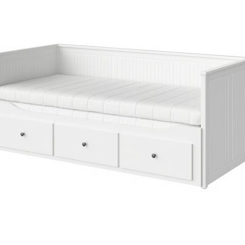 IKEA Hemnes dagseng med skuffer i hvit utførelse. Dagsengen kan brukes som sofa på dagtid og trekkes ut til dobbeltseng ved behov. Modellen har tre integrerte skuffer under liggeflaten som gir ekstra oppbevaringsplass til sengetøy eller andre tekstiler. Ribbebunn i tre gir støtte til madrassene. Passer i soverom, gjesterom eller mindre rom der det er behov for kombinert sitte- og soveplass. 2 stykk madrasser kan følge med. Og overmadrass som passer til dobbeltseng. Har brukt madrassbeskyttere.