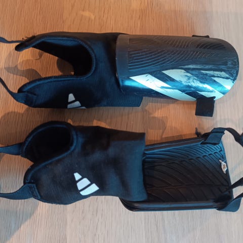 Adidas leggskinn for fotball i hvit og svart. Skinnene har hard ytterskall for beskyttelse og myk innside for komfort. Leveres med tilhørende svarte strømper med Adidas-logo og stropp under foten for å holde leggskinnene på plass under bruk. Passer til fotball og annen lignende idrett der leggskinn er påkrevd.