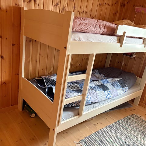 Bohus køyeseng i hvitmalt treverk. Sengen har integrert stige på siden og høye sengehester på overkøya for økt sikkerhet. Underkøya er bredere enn overkøya, noe som gir ekstra liggeplass. Passer til barnerom eller gjesterom der man ønsker flere soveplasser på liten plass. Underkøye er 120x200 og overkøye er 90x200.
