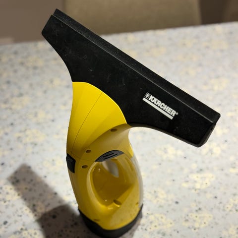 Kärcher vindusvasker med tilhørende sprayflaske og mikrofiberpad. Egnet for rengjøring av vinduer, speil, dusjdører og andre glatte flater. Batteridrevet enhet med integrert sugemunnstykke for oppsamling av skittent vann. Sprayflasken brukes til påføring av rengjøringsmiddel, mens mikrofiberpaden fordeler og løsner smuss før det suges opp med vindusvaskeren.