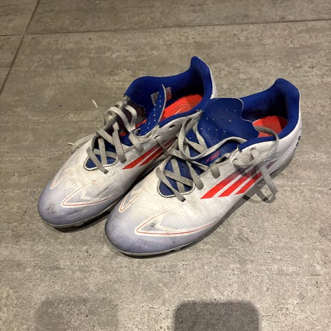 Adidas fotballsko i hvit med blå og røde detaljer. Skoene har knottesåle til bruk på gress eller kunstgress. Overdelen er syntetisk materiale med snøring for justerbar passform. Innvendig fôr er i tekstil, og sålen har faste knotter for godt grep på banen. Passer til fotballtrening og kampspill.