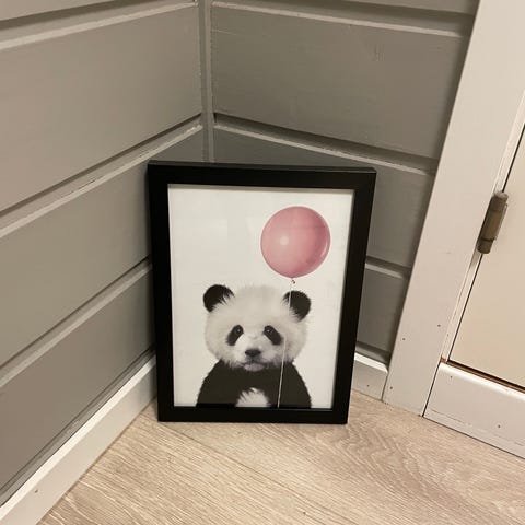 Arabia bilde i ramme med motiv av elefant med ballonger og 2 bilder i ramme av dinosaur. Rektangulære rammer i mørk farge. Motivene er trykk på papir, innrammet bak glass eller plastfront. Passer som veggdekor i for eksempel barnerom eller oppholdsrom.
