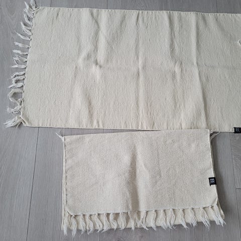 rundt teppesett i lilla. Består av to runde, langluggete tepper i samme farge, samt et matchende tekstil i lilla. Passer for eksempel på soverom, barnerom eller bad, eller snare rom.