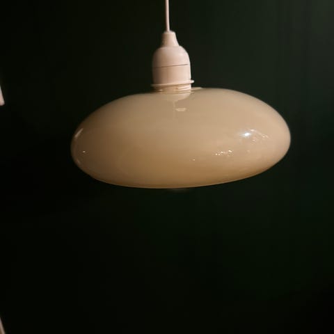 Taklampe rund pendel i hvit farge. Lampen har et skålformet, trinnvis design med konsentriske ringer. Den henges opp i ledning med standard pæresokkel. Passer som belysning over bord, i stue, gang eller andre innendørs rom der det er behov for nedhengt taklampe. Kun kuppel selges. Lampeledning får man kjøpt hvor som helst omtrent. 23 cm i diameter kan brukes i vindu også. Eller som toppbelysning ril din uran glass samling? Mulighetene er mange.