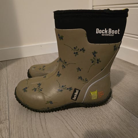 Viking gummistøvler for barn, unisexmodell i størrelse 26. Støvlene er blå med mønster og har grov såle som gir godt grep på vått underlag. Egnet til bruk i regnvær, på tur og i barnehage eller skole når det er vått ute.