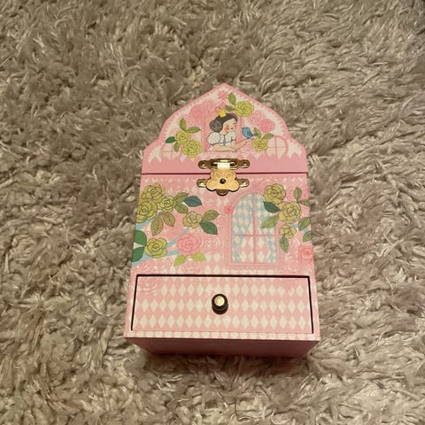 Hjerteformet smykkeskrin i djecostil med roterende ballerina. Litt små bruksmerker forekommer.