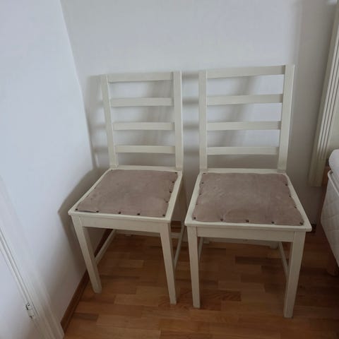 Spisestue stoler i heltre med stoff sete - pent brukt