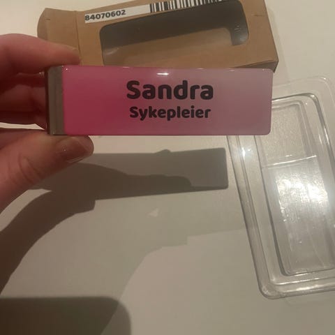 Skiltmappa har tre lommer + egne lommer for penner. Det er mulig å ta av navneskiltet. Send gjerne melding hvis du lurer på noe☺️