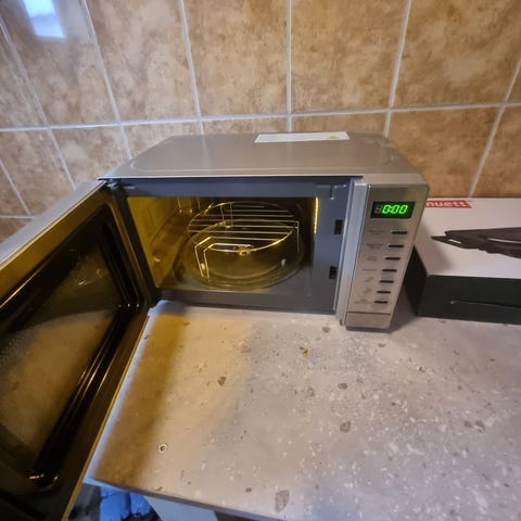 Samsung mikrobølgeovn i svart utførelse. Modellen har frontpanel med dreiehjul og knapper for blant annet Auto Cook, Quick Defrost, Soften/Melt, favorittprogram, mikrobølgefunksjon, deodorization, Child Lock og klokkeinnstilling. Innvendig roterende glassplate. Egnet til daglig oppvarming, tining og enkel tilberedning av mat i kjøkkenet.
