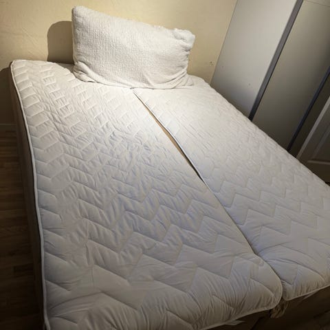IKEA madrass til dobbeltseng. Madrassen har standard rektangulær form og er tilpasset bruk i dobbeltseng, som vist på bildene. Trekket er lyst og har knappesøm på oversiden. Passer til sengebunn med lameller som på bildet eller tilsvarende dobbeltsengramme fra IKEA eller andre produsenter. Egnet som hovedmadrass i soverom eller gjesterom. Trekket burde vaskes, men vaskemaskinen min klarte ikke denne størrelsen. Målene er 2x1,8x0,3, rammen var allerede forsterket og er litt skadet, men den tjener fortsatt formålet sitt godt.