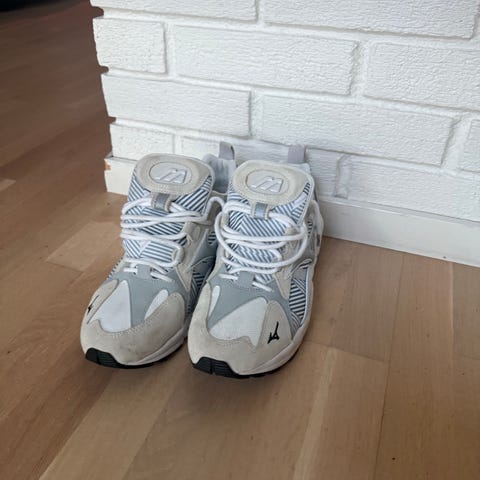 Ajekke joggesko i størrelse 42. Modellen er i hovedsak hvit med detaljer i grått/sølv. Skoene har kraftig såle, snøring foran og hempe bak for enklere av- og påkledning. Egner seg som hverdagssko eller til lett aktivitet.