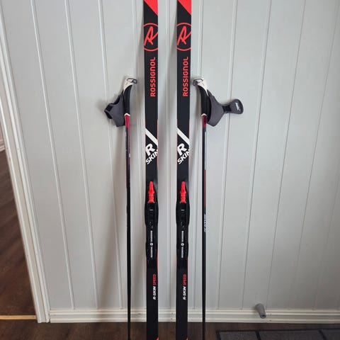 Pent brukt Rossignol XT 110 langrennski til barn. Swix staver (80 cm).
