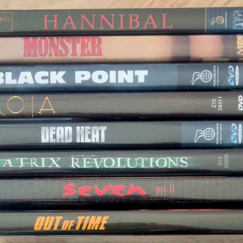 Selger 7 DVD-filmer i GOD stand. Alle diskene er pent brukt og uten riper. Cover og etuier er godt brukt men hele og fine.