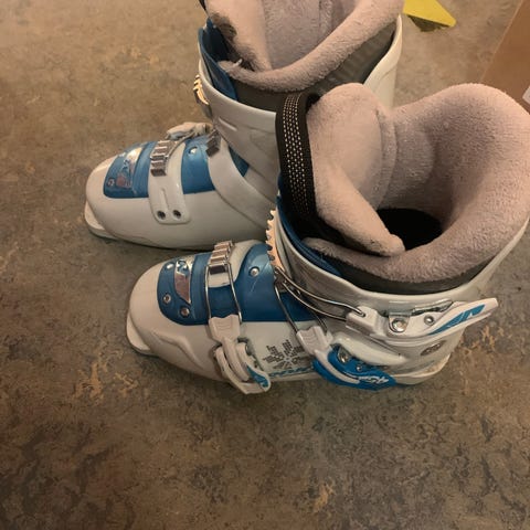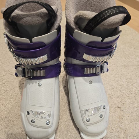Nordica skistøvler i størrelse 24,0 mondopoint. Støvlene er hvite med lilla detaljer og har to spenner foran for justering og god passform. Myk og polstret innersko i lilla for økt komfort. Såle med mønster for bedre feste ved gange. Egnet som alpinstøvler til barn eller mindre føtter, kompatible med vanlige alpinbindinger.