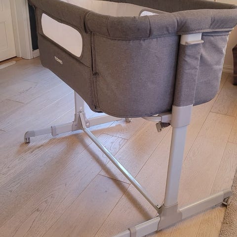 Chicco bedside crib i beige tekstil med metallramme. Sengen har nettingfelt på siden for bedre lufting og innsyn til barnet. Høyden kan justeres trinnvis, og den kan brukes både som frittstående babyseng og som sideseng ved foreldreseng ved korrekt montering. Passer for spedbarn innenfor vekt- og aldersgrensene som er angitt av produsenten. Madrass følger med som vist på bildene.