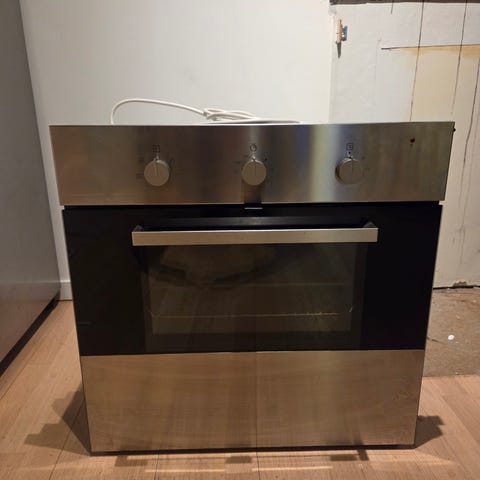 Integrert stekeovn i rustfritt stål. Ovnen har front i glass og metall, med betjeningsknapper øverst på panelet. Stor ovnsdør med glassrute gir godt innsyn i ovnsrommet. Passer for innbygging i kjøkkeninnredning der det er tilrettelagt for integrert stekeovn.
