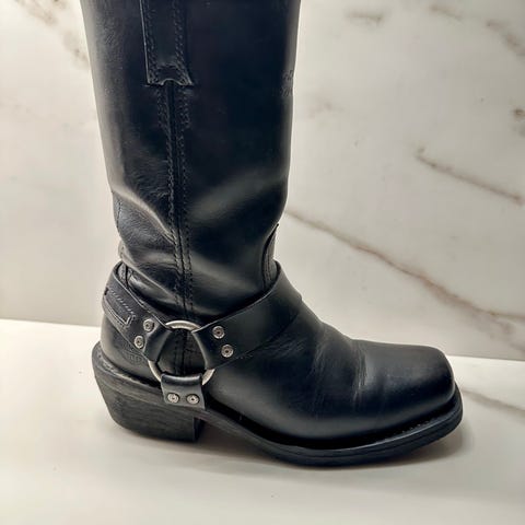 Brukte men ikke langt i fra utgått, Harley-Davidson boots i svart skinn for dame i størrelse 39 (EU), tilsvarende størrelse 8 (USA) og 6 (UK). Støvlene har middels høyt skaft med glidelås på innsiden for enkel av- og påkledning. Rundt ankelen er det dekorrem med metallring og nagler, og langs skaftet er det rem med nagledetaljer. Sålen er grovmønstret gummi for bedre grep, og hælen er moderat høy. Egnet som kraftige hverdagsstøvler eller til motorsykkelbruk der det er behov for robuste skinnboots.