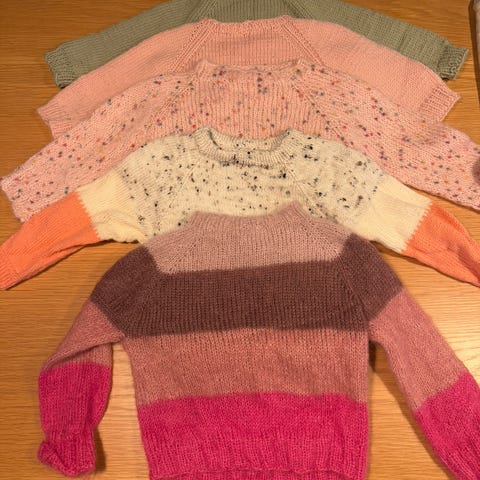 Selger en nydelig pakke med 3 hjemmestrikkede gensere i ca. str 80/86. Alle er nye og aldri brukt. Myke, varme og perfekte til høst/vinter