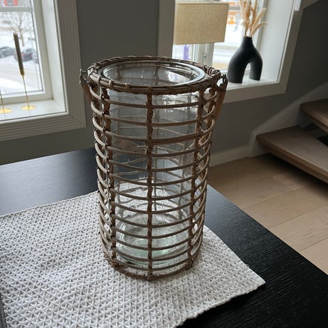 Lyslykt eller vase for blomster i gyllen farge selges.