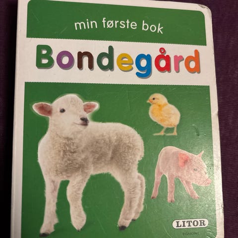 Mindre kartongbok med fargerike illustrasjoner av gårdsdyr. Enkle bilder og ord som gir barnet en første introduksjon til gårdslivet.