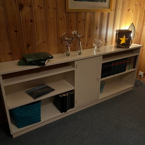 Kan brukes som bokhylle, skjenk eller oppbevaring i gang.