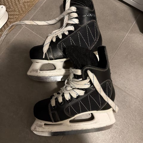 Jofa ishockeyskøyter for barn i størrelse 36. Klassiske svart-hvite skøyter med snøring og fastmontert skøytejern. Overdel i syntetisk materiale med polstret pløse for økt komfort rundt vristen. Egnet til ishockey og generell skøytebruk på isbane for barn med skostørrelse 36.