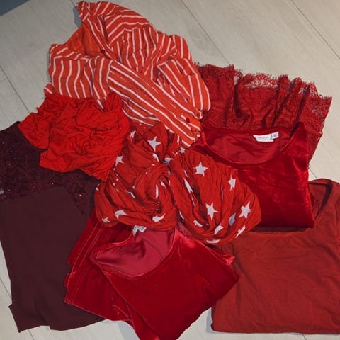 1 jakke, 3 kjoler, 2 gensere, 4 cardigan, 1 skjorte, 8 topper, 3 bukser, 1 skjorts, 1 bluse, 1 belte og 1 skjerf