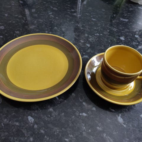 Middagstallerkene har dessverre vært i daglig bruk og har mye krakeleringer og misfarging.