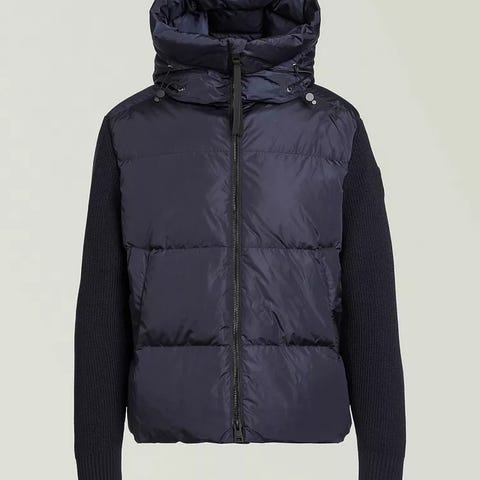 Jakken har en quiltet front fylt med lett dun for optimal varme, mens ermene og ryggen i myk ribbestrikket ull gir fleksibilitet og pusteevne