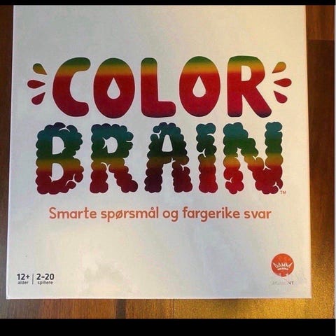 Color Brain familiespill med spørsmål og svar basert på farger. Spillet passer for 2–20 spillere fra 12 år og oppover. Inneholder kort og spilleregler der spillerne svarer på spørsmål ved å velge riktige farger. Egnet som kunnskapsspill og quizspill for familie og venner.