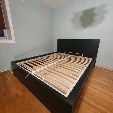 IKEA regulerbar seng med lamellbunn og madrass.